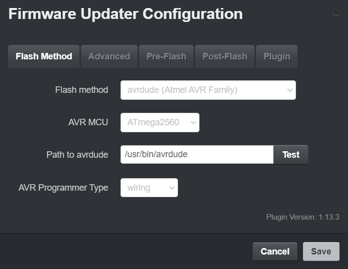 OctoPrint should have the Firmware Updater plugin installed, and the Raspberry Pi needs the avrdude binary available: sudo apt install avrdude. In OctoPrint, go to the plugin settings for Firmware Updater and paste the link to the .hex file from the Prusa Github Release Page in the “from url” field. The wrench icon in the top right corner of the window controls how the firmware is flashed. The Prusa uses the avrdude flash method, the AVR MCU is ATmega2560, path to avrdude is /usr/bin/avrdude, and the AVR programmer type is wiring.